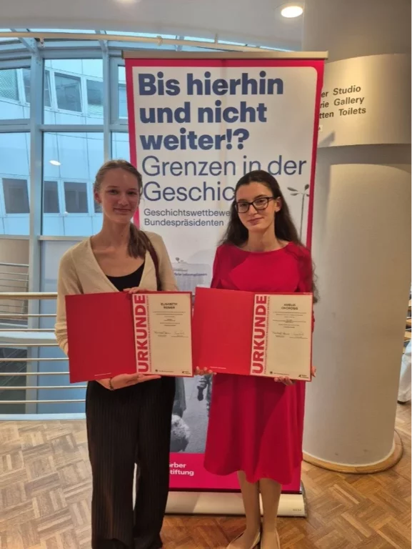 Am 28.08.2025 wurden gleich zwei unserer Schülerinnen, Amelia Chorosis (9.3) und Elisabeth Reimer (10.1), mit jeweils einem Landessieg für die Teilnahme am Geschichtswettbewerb des Bundespräsidenten ausgezeichnet. Im Rahmen einer feierlichen Feststunde wurde ihnen und den weiteren Gewinnern des Wettbewerbs im Zeitgeschichtlichen Forum in Leipzig durch Staatssekretär Wilfried Kühner und Eva Namela (Vorstand der Körber-Stiftung) eine Urkunde überreicht. Unter dem Thema „Bis hierhin und nicht weiter!? – Grenzen in der Geschichte“ konnten die Teilnehmer wissenschaftliche und kreative Beiträge einreichen. Amelia begab sich diesbezüglich auf Spurensuche in der eigenen Familiengeschichte und stellte ihre Arbeit unter den Titel „Kalo Taxidi – Ein Leben als griechischer Gastarbeiter fernab der Heimat für eine bessere Zukunft“. Ähnlich forschte auch Elisabeth in der eigenen Familie zu Grenzen und deren Überwindung. Unter dem Titel "Potrawke- Flucht ins eigene Land" reichte sie einen 15-minütigen Videobeitrag ein.